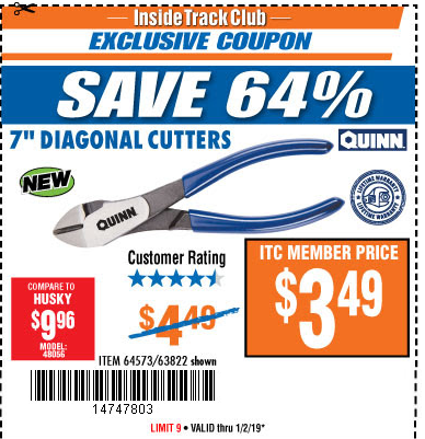 ITC QUINN 7 IN. DIAGONAL CUTTERS Lot No. 64573 Expired: 1/2/19 - $3.49 Coupon Code: '14747803'