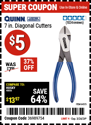 QUINN 7 IN. DIAGONAL CUTTERS Lot No. 64573 Expired: 12/29/24 - $4.99 Coupon Code: '57330034'