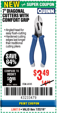 QUINN 7 IN. DIAGONAL CUTTERS WITH COMFORT GRIP Lot No. 64105 Expired: 7/22/18 - $3.49 Coupon Code: '43233479'