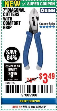 QUINN 7 IN. DIAGONAL CUTTERS WITH COMFORT GRIP Lot No. 64105 Expired: 8/26/18 - $3.49 Coupon Code: '57885300'