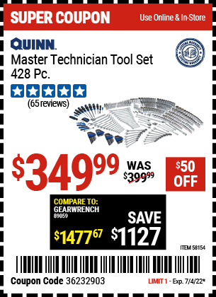 QUINN MASTER TECHNICIANS TOOL SET, 428-PIECE Lot No. 58154 Expired: 7/4/22 - $349.99 Coupon Code: '36232903'