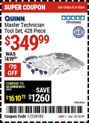 QUINN MASTER TECHNICIANS TOOL SET, 428-PIECE Lot No. 58154 Expired: 10/13/22 - $349.99 Coupon Code: '17238185'