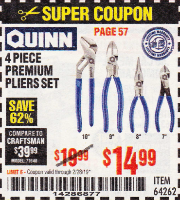QUINN PLIERS SET, 4-PIECE Lot No. 64262 Expired: 2/28/19 - $14.99 Coupon Code: '14286877'