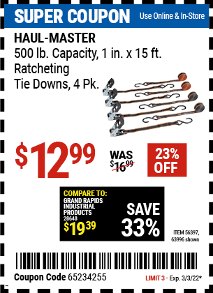 RATCHETING TIE DOWNS Lot No. 56397 Expired: 3/3/22 - $12.99 Coupon Code: '65234255'