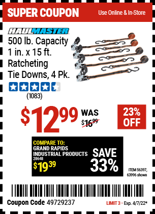RATCHETING TIE DOWNS Lot No. 56397 Expired: 4/7/22 - $12.99 Coupon Code: '13832591'