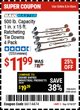 RATCHETING TIE DOWNS Lot No. 56397 Expired: 9/18/22 - $11.99 Coupon Code: '66114474'