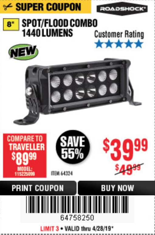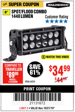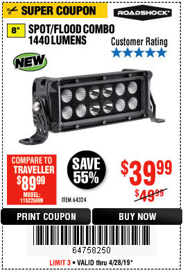 ROADSHOCK 1440 LUMENS 8 IN. COMBO LIGHT BAR Lot No. 64324 Expired: 4/28/19 - $39.99 Coupon Code: '64758250'