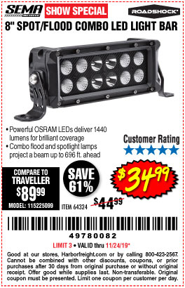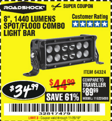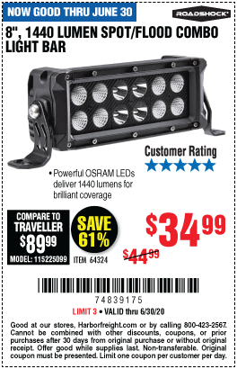 ROADSHOCK 1440 LUMENS 8 IN. COMBO LIGHT BAR Lot No. 64324 Expired: 11/25/18 - $39.99 Coupon Code: '24276795'