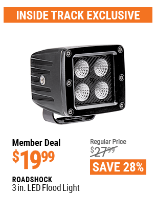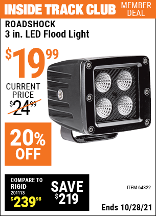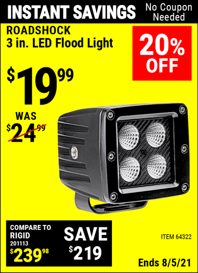 ROADSHOCK 3 IN. LED FLOOD LIGHT Lot No. 64322 Expired: 8/5/21 - $19.99 Coupon Code: 'n/a'