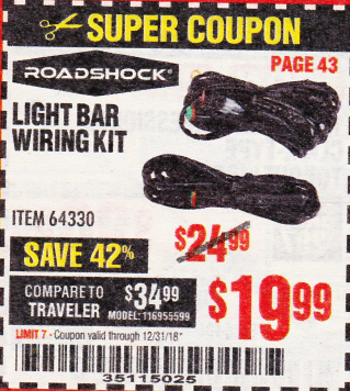 ROADSHOCK OFF-ROAD LIGHT WIRING KIT Lot No. 64330 Expired: 7/21/19 - $19.99 Coupon Code: '38869143'