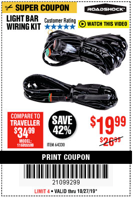 ROADSHOCK OFF-ROAD LIGHT WIRING KIT Lot No. 64330 Expired: 4/28/19 - $19.99 Coupon Code: '64759884'