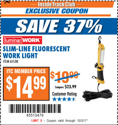 ITC SLIM-LINE FLUORESCENT WORK LIGHT Lot No. 61538/46114 Expired: 10/3/17 - $14.99 Coupon Code: '45510478'