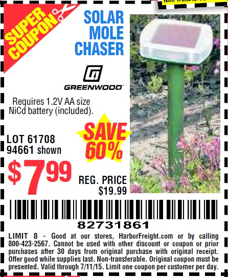 SOLAR MOLE CHASER Lot No. 61708/94661 Expired: 7/11/15 - $7.99 Coupon Code: '82731861'