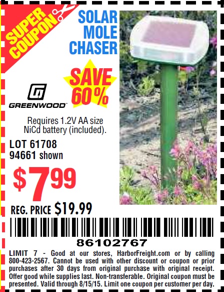 SOLAR MOLE CHASER Lot No. 61708/94661 Expired: 8/15/15 - $7.99 Coupon Code: '86102767'