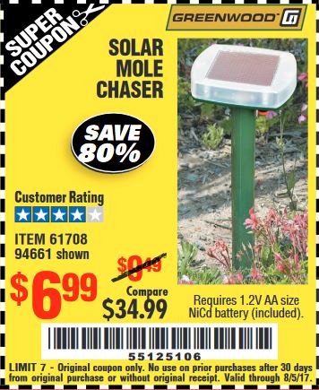 SOLAR MOLE CHASER Lot No. 61708/94661 Expired: 8/5/17 - $6.99 Coupon Code: '55125106'
