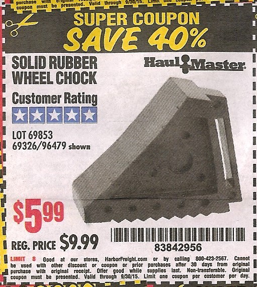 SOLID RUBBER WHEEL CHOCK Lot No. 69326/69853/56891/96479 Expired: 9/30/15 - $5.99 Coupon Code: '83842956'