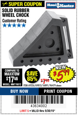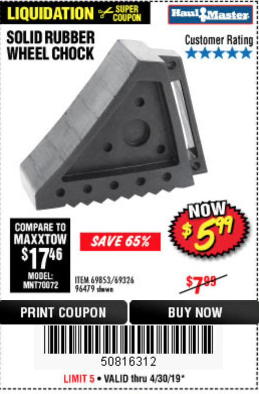 SOLID RUBBER WHEEL CHOCK Lot No. 69326/69853/56891/96479 Expired: 6/30/19 - $4.99 Coupon Code: '90082893'