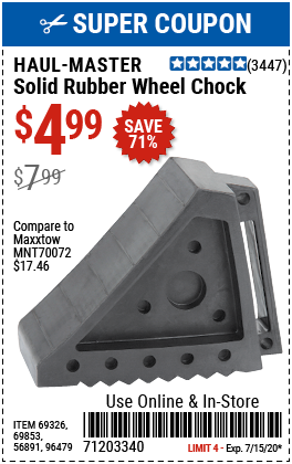SOLID RUBBER WHEEL CHOCK Lot No. 69326/69853/56891/96479 Expired: 7/31/19 - $5.99 Coupon Code: '69337757'