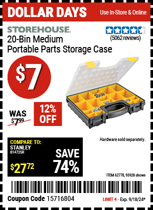 STOREHOUSE 20-BIN MEDIUM PORTABLE PARTS STORAGE CASE Lot No. 62778/93928 Expired: 12/14/25 - $6.99 Coupon Code: '73555022'