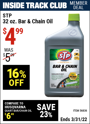 ITC STP 32 OZ. BAR & CHAIN OIL Lot No. 56836 Expired: 3/31/22 - $4.99 Coupon Code: 'n/a'