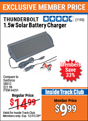 THUNDERBOLT 1.5W SOLAR BATTERY CHARGER Lot No. 64251 Expired: 7/1/21 - $9.99 Coupon Code: '15432392'