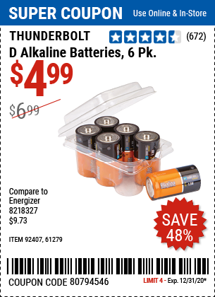 THUNDERBOLT D ALKALINE BATTERIES, 6 PK. Lot No. 92407 Expired: 12/31/20 - $4.99 Coupon Code: '80794546'