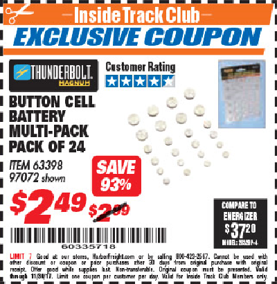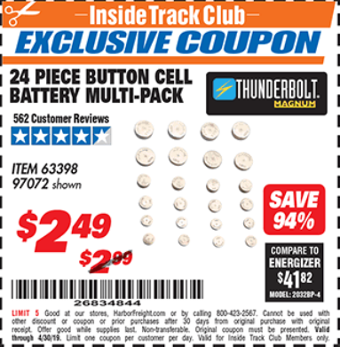 THUNDERBOLT MAGNUM BUTTON CELL BATTERY ASSORTMENT, 24-PIECE Lot No. 63398 Expired: 10/31/19 - $2.49 Coupon Code: '68212123'