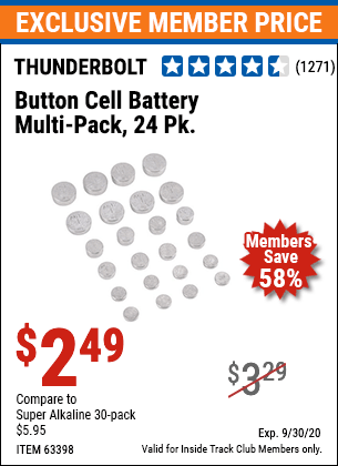 ITC THUNDERBOLT MAGNUM BUTTON CELL BATTERY ASSORTMENT, 24-PIECE Lot No. 63398 Expired: 9/30/20 - $2.49 Coupon Code: 'n/a'