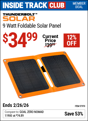 ITC THUNDERBOLT SOLAR 9 WATT FOLDABLE SOLAR PANEL Lot No. 57970 Valid Thru: 2/26/26 - $34.99 Coupon Code: 'n/a' (current price - 20% = 0) add to list