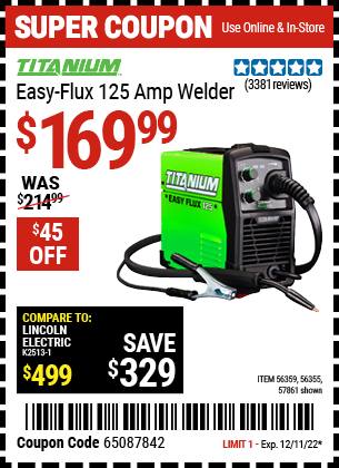 TITANIUM EASY-FLUX 125 AMP WELDER Lot No. 56359/56355/57861 Expired: 12/11/22 - $169.99 Coupon Code: '65087842'