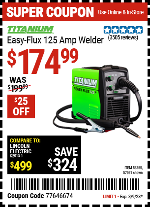 TITANIUM EASY-FLUX 125 AMP WELDER Lot No. 56359/56355/57861 Expired: 3/9/25 - $119.99 Coupon Code: 'n/a'