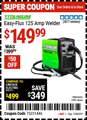 TITANIUM EASY-FLUX 125 AMP WELDER Lot No. 56359/56355/57861 Expired: 7/30/23 - $149.99 Coupon Code: '75231446'