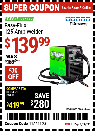TITANIUM EASY-FLUX 125 AMP WELDER Lot No. 56359/56355/57861 Expired: 4/13/25 - $119.99 Coupon Code: 'n/a'