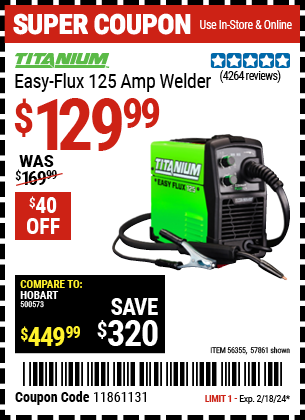 TITANIUM EASY-FLUX 125 AMP WELDER Lot No. 56359/56355/57861 Expired: 2/18/24 - $129.99 Coupon Code: '11861131'
