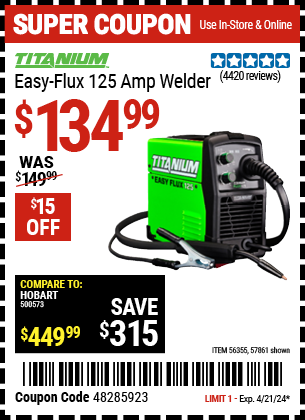 TITANIUM EASY-FLUX 125 AMP WELDER Lot No. 56359/56355/57861 Expired: 4/21/24 - $134.99 Coupon Code: '48285923'