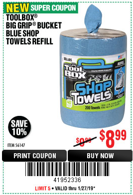 TOOLBOX BIG GRIP® BUCKET BLUE SHOP TOWELS REFILL Lot No. 56147 Expired: 1/20/19 - $8.99 Coupon Code: '37734767'