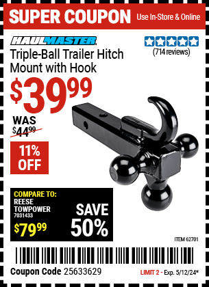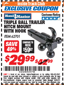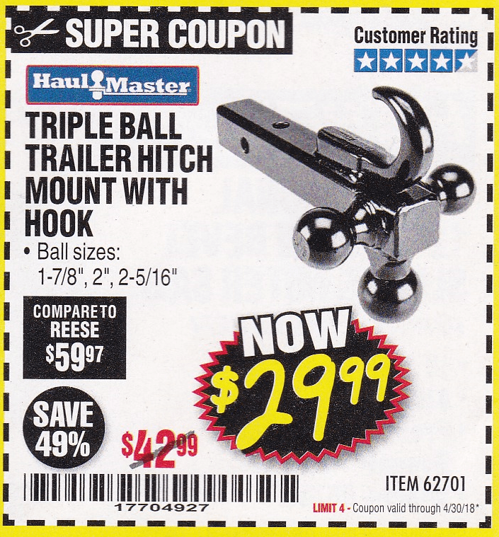 HAUL-MASTER TRIPLE-BALL TRAILER HITCH MOUNT WITH HOOK Lot No. 62701 Expired: 4/30/18 - $29.99 Coupon Code: '10165659'
