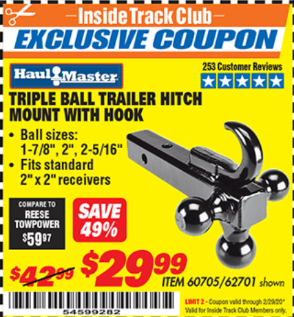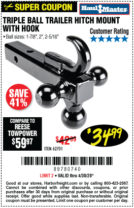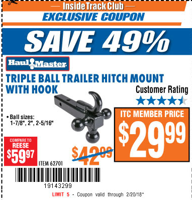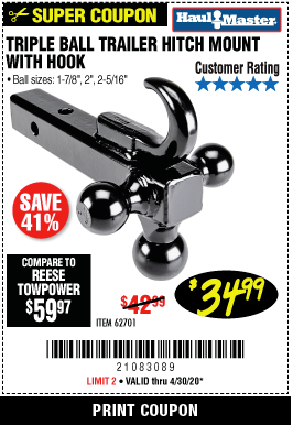HAUL-MASTER TRIPLE-BALL TRAILER HITCH MOUNT WITH HOOK Lot No. 62701 Expired: 2/29/20 - $29.99 Coupon Code: '40312304'