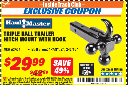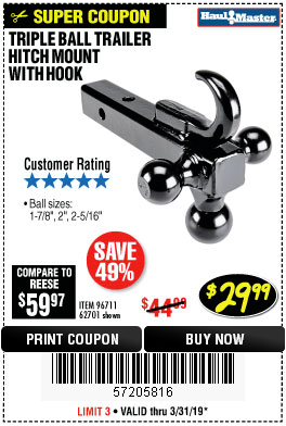 HAUL-MASTER TRIPLE-BALL TRAILER HITCH MOUNT WITH HOOK Lot No. 62701 Expired: 5/31/19 - $29.99 Coupon Code: '95986069'