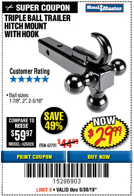 HAUL-MASTER TRIPLE-BALL TRAILER HITCH MOUNT WITH HOOK Lot No. 62701 Expired: 9/30/18 - $29.99 Coupon Code: '15286903'