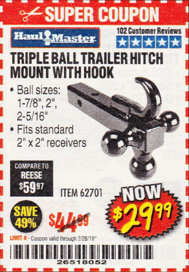 HAUL-MASTER TRIPLE-BALL TRAILER HITCH MOUNT WITH HOOK Lot No. 62701 Expired: 2/28/19 - $29.99 Coupon Code: '26518052'