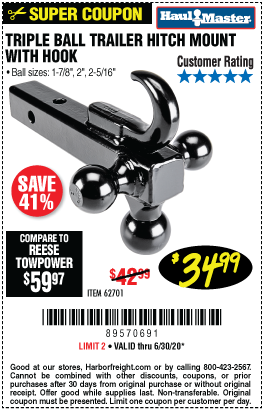 HAUL-MASTER TRIPLE-BALL TRAILER HITCH MOUNT WITH HOOK Lot No. 62701 Expired: 6/30/20 - $34.99 Coupon Code: '89570691'