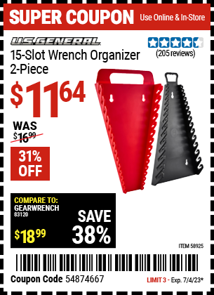 U.S. GENERAL 15-SLOT WRENCH ORGANIZER, 2-PIECE Lot No. 58925 Expired: 9/28/25 - $9.99 Coupon Code: '12536711'