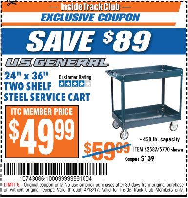 ITC U.S. GENERAL 36 IN. X 24 IN. 2-SHELF STEEL SERVICE CART, BLACK Lot No. 62587/5770 Expired: 4/18/17 - $49.99 Coupon Code: '10743086'