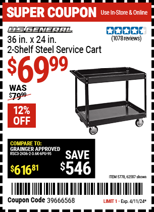 U.S. GENERAL 36 IN. X 24 IN. 2-SHELF STEEL SERVICE CART, BLACK Lot No. 62587/5770 Valid Thru: 3/8/26 - $69.99 Coupon Code: '26121843' (current price - 20% = 0) add to list