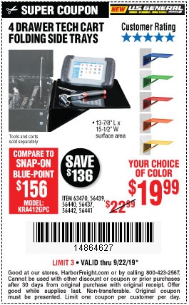 U.S. GENERAL FOLDING SIDE TRAY FOR 4-DRAWER TECH CART Lot No. 56437/56439/56440/56441/56442/63470/72414/72415 Expired: 9/22/19 - $19.99 Coupon Code: '14864627'