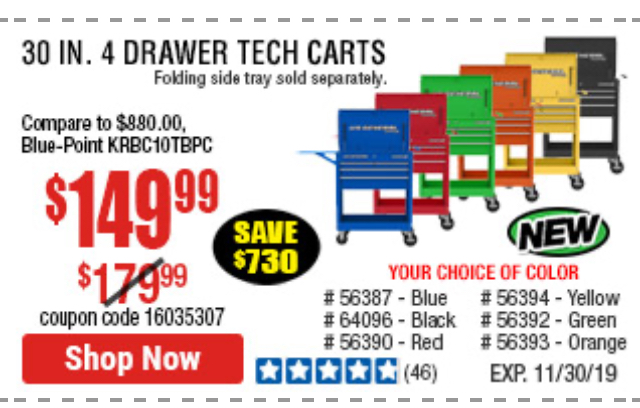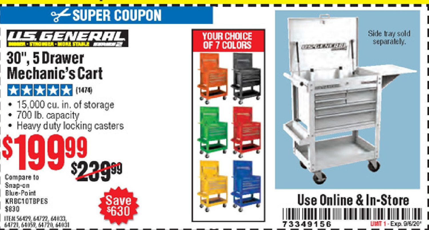 U.S. GENERAL FOLDING SIDE TRAY FOR 4-DRAWER TECH CART Lot No. 56437/56439/56440/56441/56442/63470/72414/72415 Expired: 9/6/20 - $199.99 Coupon Code: '73349156'