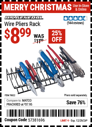 U.S. GENERAL WIRE PLIERS RACK Lot No. 70022 Expired: 12/29/24 - $8.99 Coupon Code: '57381696'