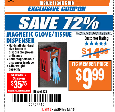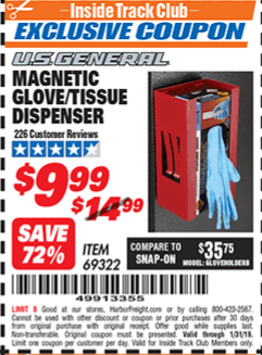 U.S. General Magnetic Glove/tissue dispenser Lot No. 64646/57284/56460/56461/56462/56463/69322/72361 Valid Thru: 12/1/25 - $12.99 Coupon Code: '72601080' (current price - 20% = 0) add to list