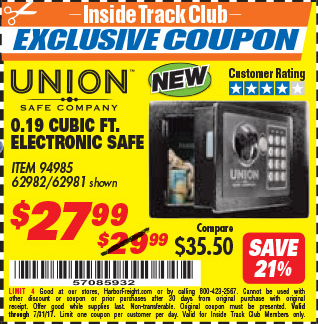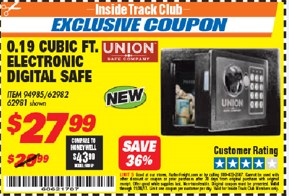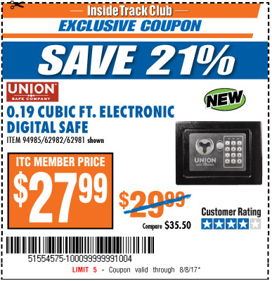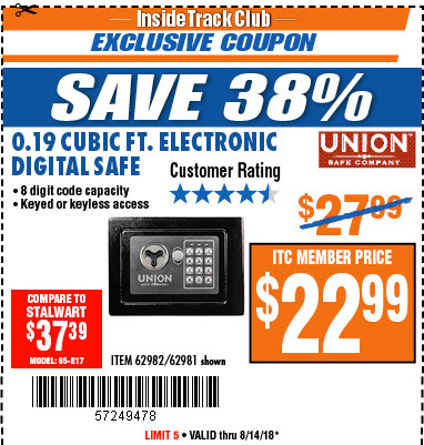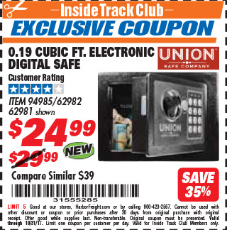 ITC UNION SAFE COMPANY 0.19 CU. FT. ELECTRONIC DIGITAL SAFE Lot No. 62981/62982 Expired: 10/31/17 - $24.99 Coupon Code: '31555285'